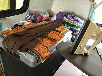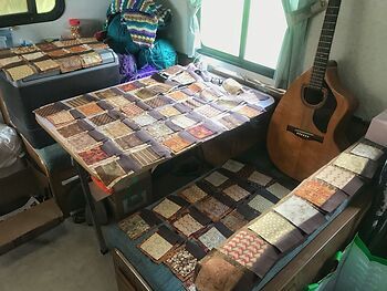 Kitchen table in the trailer serves as my cutting table. Seats along the one side hold box of fabric and my yarn for my afghan. If you look close you will see my supply of snacks behind on shelf!
